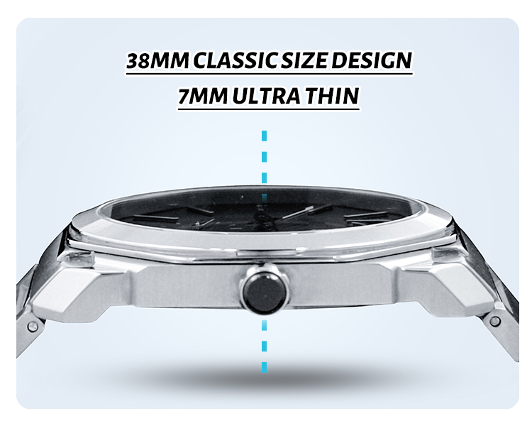 – The quartz watch case is designed to be ultra-thin or slim for a sleek and minimalist look.